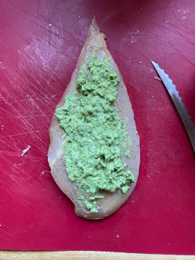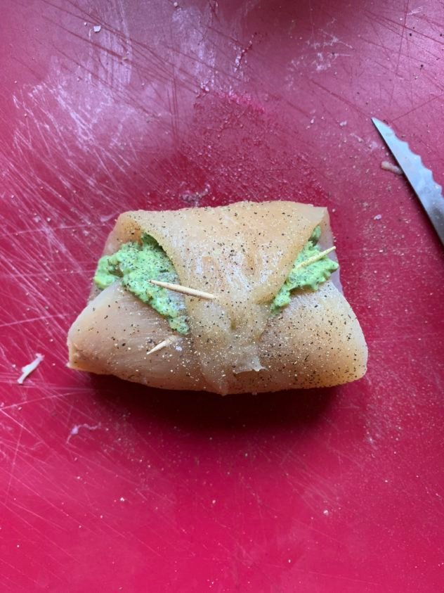 I bought pre-portioned chicken breasts from Walmart – each piece was 5-6 ounces. I used a heaping tablespoon of the artichoke spinach dip on each piece of chicken. For the record, you’ll still probably have filling leftover.