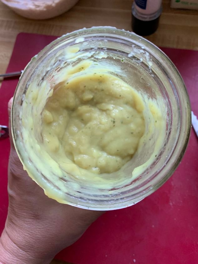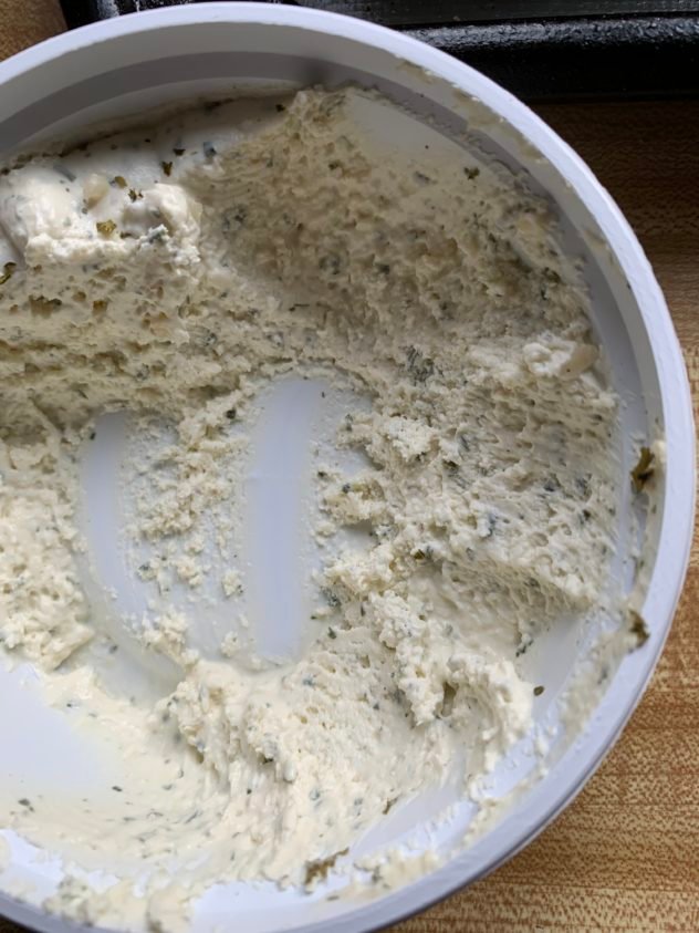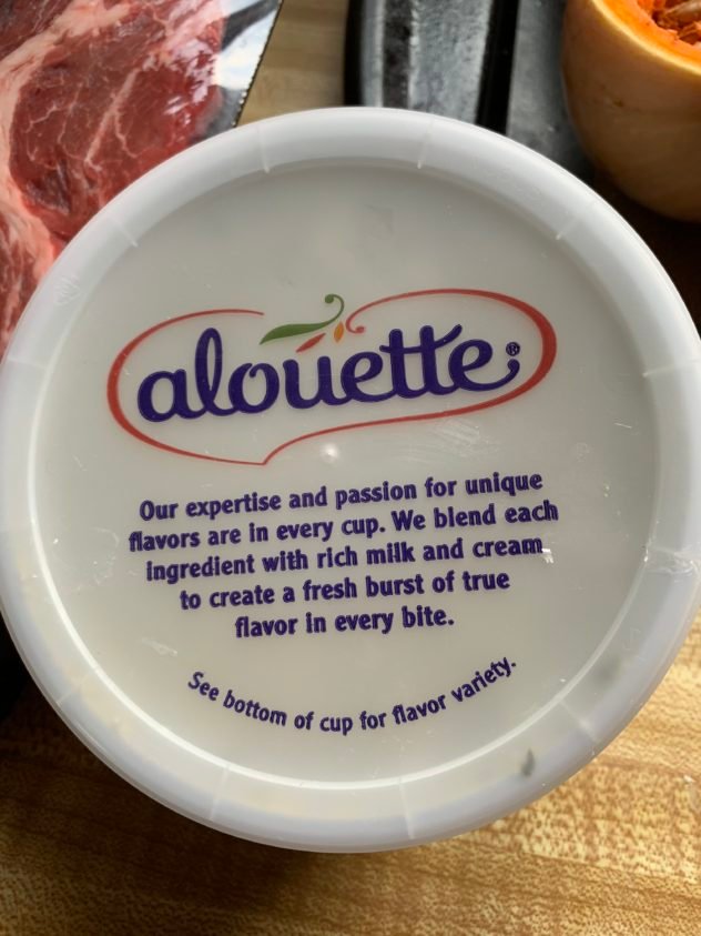 My secret weapon in the filling is two tablespoons of this Alouette brand spreadable garlic and herb cheese – holy yum!