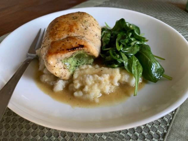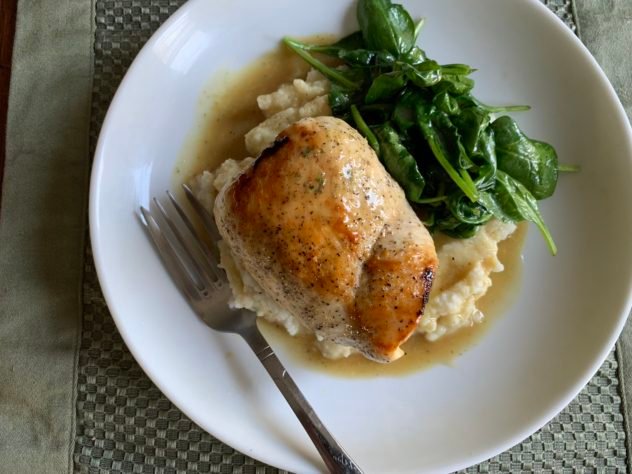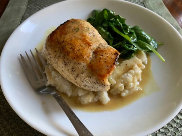 At home I plated this with 1/2 cup mashed potatoes and salt and vinegar spinach.