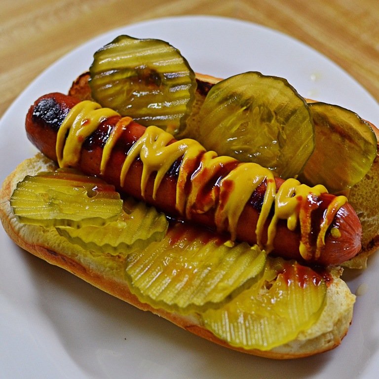 Aren’t I a horrible tease?!   Right across the street from where I was is Gene’s Sausage Shop.   I bought skinless all beef hot dogs and decided that would be dinner.  Nothing like a butcher shop hot dog.  I had mine on a Turano bun, dill pickles, lot’s of Plochman’s mustard and hot sauce.  Perfect combo.  9 smart points Open-mouthed smile