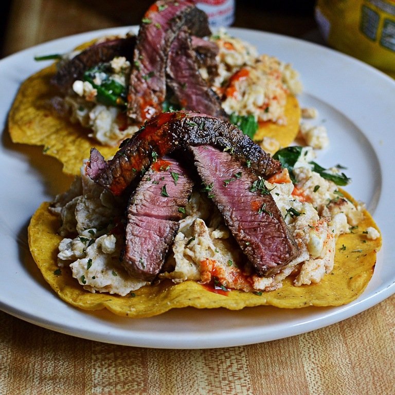 As I normally do on my work days, I eat a late breakfast.  Well, because of my ambitious idea for breakfast, and how close it was before I had to leave for work, basically after this photo was taken, I pulled the steak off, chopped it up, threw it in a plastic container with the eggs and broke the tostada into pieces to eat in the 50 minute car ride to work.  Still tasted delicious!  Two tostadas (5), 3 ounces steak (3), 1/2 ounce cheese (2) and 1/2 cup of egg whites with baby spinach.  10 smart points and a whopping 39 grams of protein, this kept me fueled and full for hours.