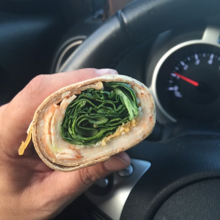 It was so steady busy that I didn’t have a chance to eat my wrap until I got in the car after packing up around 7:15.  Um, Dietz & Watson, I didn’t know you made a sriracha deli chicken!   I made a sriracha chicken wrap with reduced fat cheddar cheese and baby spinach on Aldi’s flatbread.  I ate half my sammie in the car back to the shop and was going to finish eating it on the way home, but while unpacking at the shop, my lunch bag fell out of the car, and the other half of my sandwich fell into a puddle.