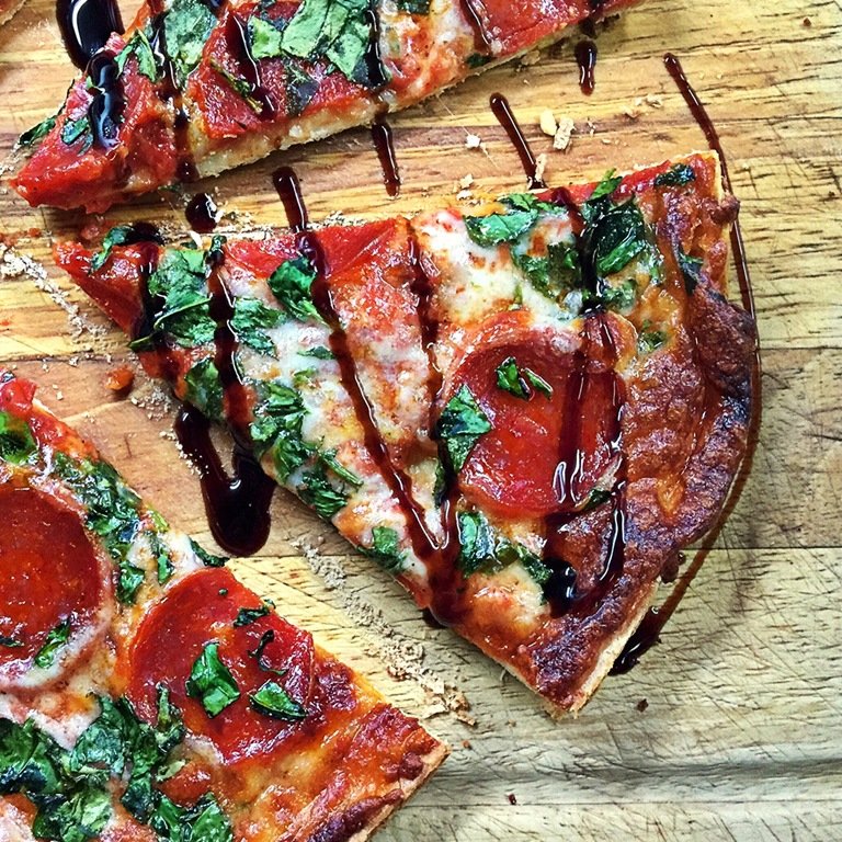 So I picked up a frozen pizza.  I know I had planned on eating steak for dinner last night, but it was nearly 10:30 by the time I ate, and I just didn’t feel like anything heavy sitting in my stomach before going to bed.  I did not know Gino’s East pizza (Chicago chain) made a thin crust frozen pizza.  First I’d like to thank them for making the serving size 1/4 of the whole pizza.  I hate when I pick up a frozen pizza and a serving size is 1/6 – really?  Who eats just 1/6 serving of a frozen pizza?  1/4 of the pizza was 8 smart points.  I picked up turkey pepperoni and accessorized the pizza with the pepperoni and baby spinach, then a drizzle of balsamic glaze to finish it off.  Two slices = 10 smart points.  Perfect!