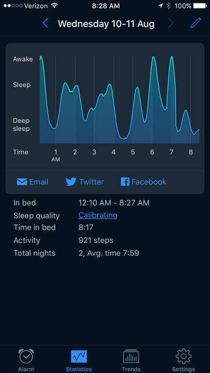 I’ve always talked about my gift of sleep.  In fact when Tony and I first got together he couldn’t believe that 1.  I could fall asleep so fast and 2. that I hardly ever moved during sleep.  I found an app called Sleep Cycle.  You place your phone screen side down and it will somehow track your sleep.  Just like when I worked at the restaurant, it didn’t matter if I was on my feet for 8 hours, I still take time to watch t.v. or go on Facebook before going to bed.  I went to bed at midnight and woke up around 8:30.  Check it out: