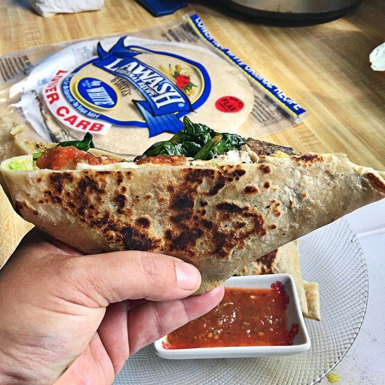 Each giant wrap is only 80 calories and 2 smart points. I had some leftover steak and made a steak/egg white/spinach breakfast burrito. The texture of the wrap is kind of chewy, so after I wrapped it up, I brushed the wrap with a touch of olive oil and pan fried it a bit for some texture. This was delicious!