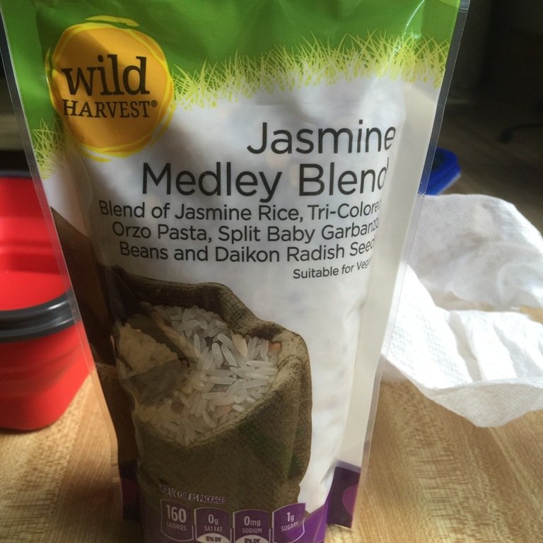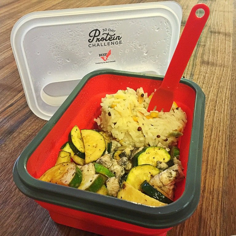 My friends at Beef It’s What’s For Dinner are promoting another 30 day protein challenge. You can check it out here. To help spread the word, they sent me these collapsible containers with plastic ware. I packed 1/2 a cup of the jasmine blend (5) with 4 ounces of chicken breasts sauteed with zucchini and 1 tsp. of grapeseed oil (5).