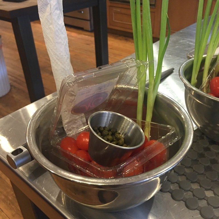 I couldn’t wait to get started for the Chicken 101 class I was doing after I ate. Basically my job is to get everything together that you might need for the class so that the class runs smoothly and on time. We were preparing three different chicken dishes with three different sauces. My trainer Jess and I gathered all the ingredients together and based on the amount of people we had attending, had three different groups so we put everything together times three. Here is an example – this is the mise en place for the grape tomato and caper relish that went on the pesto grilled chicken breast.