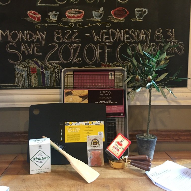 All of the appliances they use are residential grade so that you can recreate the recipes at home and get the same results that we have at the cooking school. Students get 10% off anything in the store if they attend the class, and 15% off “hot ticket” items – or basically the tools they used during class. We put a little set up in the front: