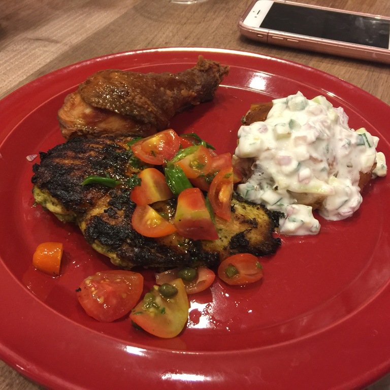 One of the things I have been doing for the last few years is spatchcocking a chicken – now don’t let you mind go to the gutter – it’s just cutting out the back bone of the whole chicken so that it can cook more evenly and faster. The Greek chicken was one of the first dishes we put together because it took an hour to cook. It was paired with a cucumber mint yogurt sauce. The chicken was rubbed under the skin and on top of the skin with a compound butter. Perfection!