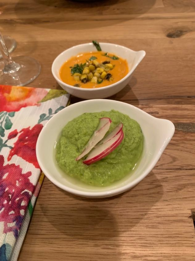 Julie made a duo of vegan chilled soups.  First was a carrot and ginger soup with charred corn and jalapeno with fresh herbs.  The other was an asparagus and avocado soup with radish.  If I could have licked those bowls, I would have!