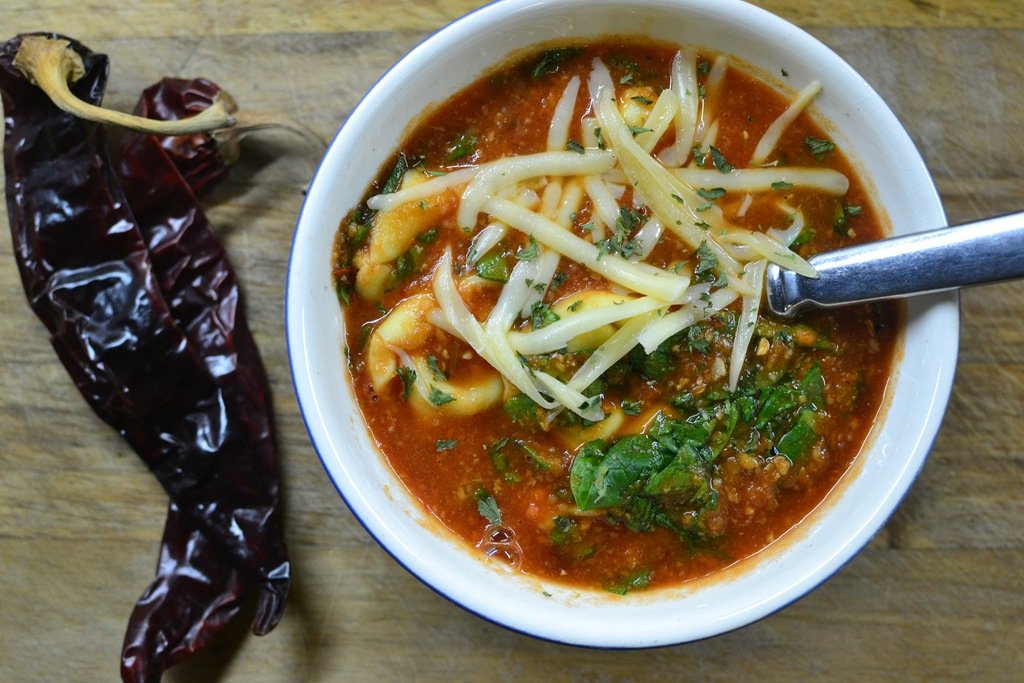 My bowl would only fit one cup of the soup with the tortellini and baby spinach, and I thought I’d top it off with the second cup once I ate some of it, but I was really full.  The soup is flavorful spicy which I love!  And I like how the corn and hominy thickened up the soup.  Here is the perfect bite: