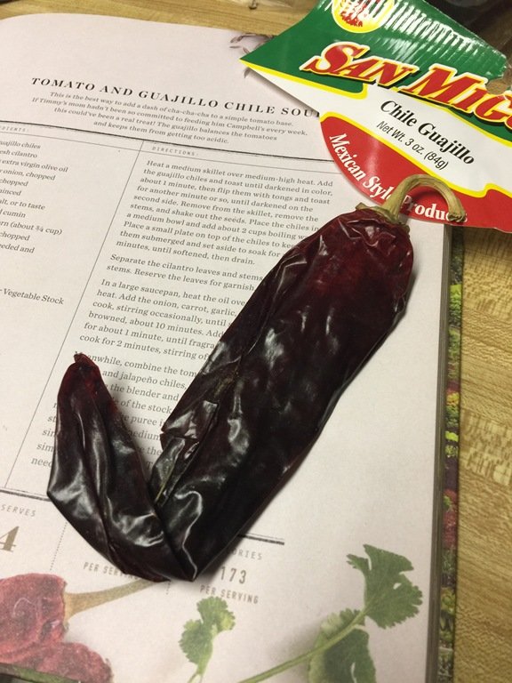 If you’ve never used dried guajillo peppers, they are really delicious.   You need to reconstitute them before using them in a recipe.  The seeds also hold the heat, so before soaking them, I tapped out all the seeds after cutting off the top.  They are cheap too – I got a bag of about a dozen for $1.69 at my local grocery store.  The cilantro I bought was bad, so I left that out, but feel free to add it to your soup!
