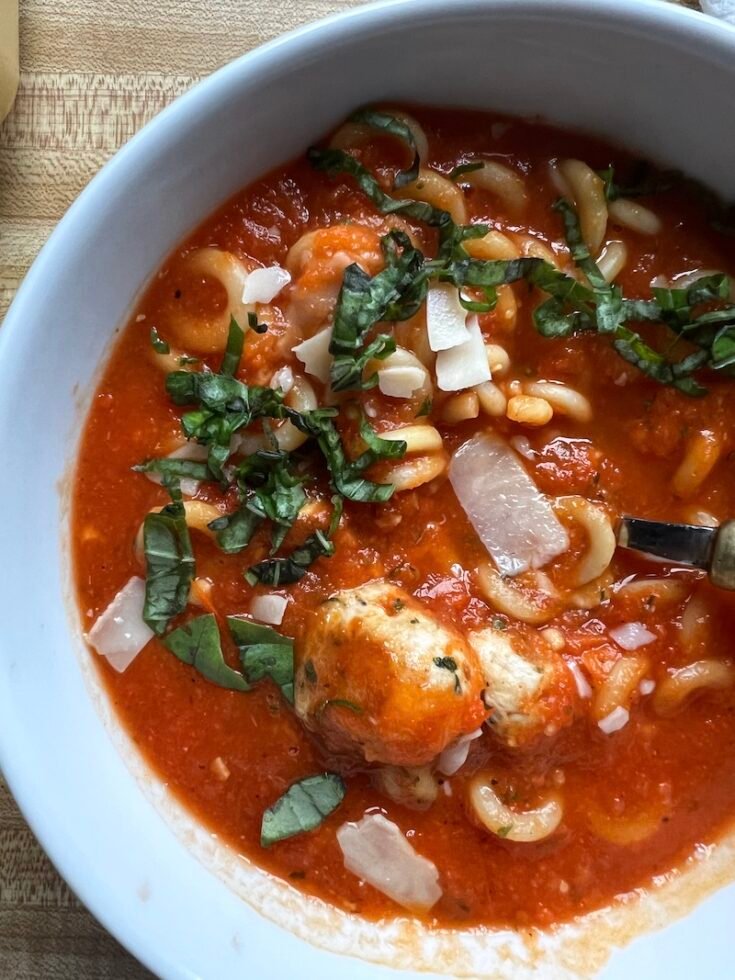 This is a bowl of tomato soup with Italian meatballs.