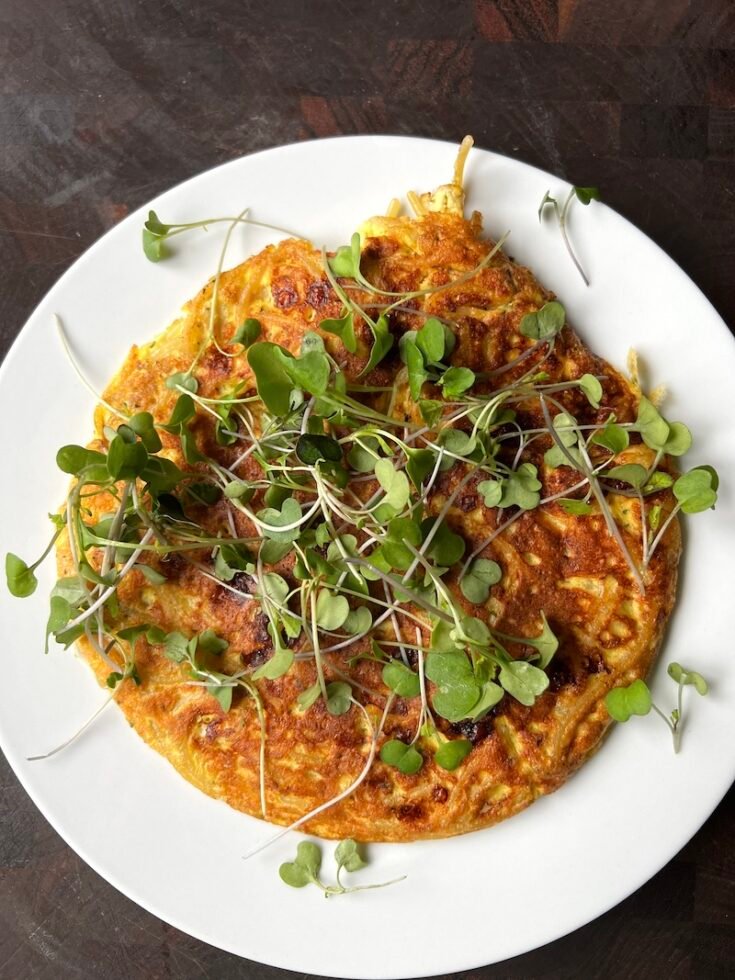 A great way to use up leftover pasta - make a frittata! Feel free to add baby spinach or other veggies hanging out in your fridge.