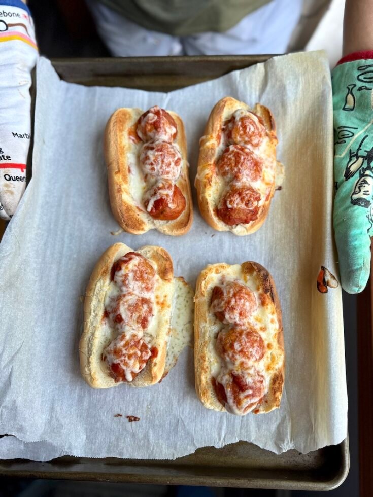 While the meatballs are cooking, prepare the tater tots according to the package directions. Aim to time it so they finish around the same time as the subs.