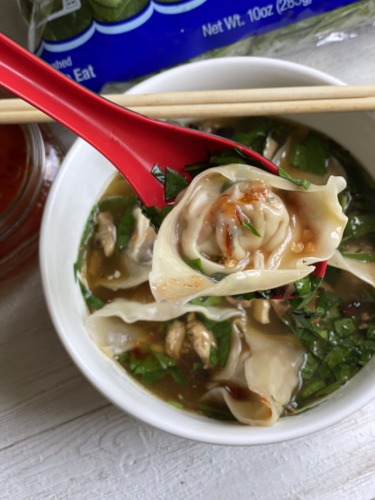 To serve: put 1/2 cup chopped baby spinach in your bowl, add in 2 cups of the wonton broth and add your steamed wontons to the bowl. Enjoy!