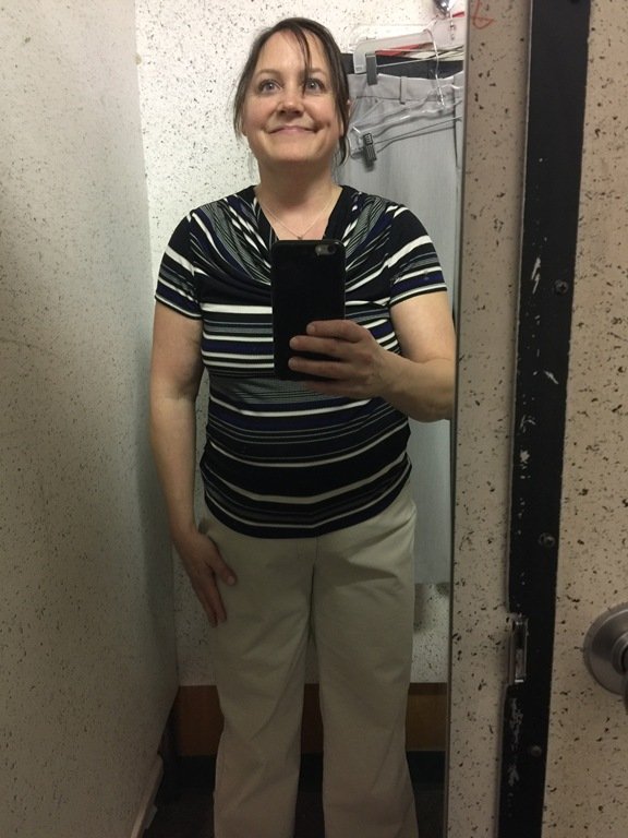 And guess what?  They fit!  I didn’t end up buying this pair because they were still a bit big in the pant leg area, but the fact that I could zip them up and button them without lying down on my bed is the best #nsv!  Hannah has told me that I should be wearing “tapered” pants but I am not sure I’ll have much luck at thrift stores, but I am up for the challenge!  I don’t want to spend too much money on clothes (ha, not like I normally do!) because by the end of spring/summer, I hope to be smaller still. Open-mouthed smile