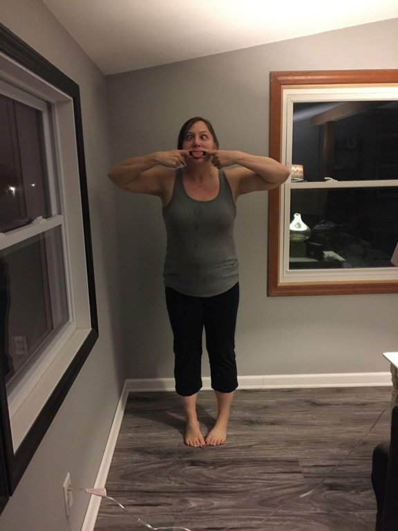 But I digress!  It’s time for progress pics!  I had Hannah take the picture last night – she was making me laugh!  She’s a bit farther away than I normally set up the camera, but I think I can see some change!   My face definitely looks thinner, as do my legs.  What’s up with the damn middle section – ha!