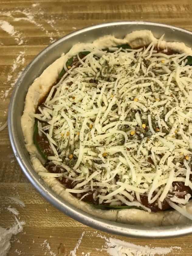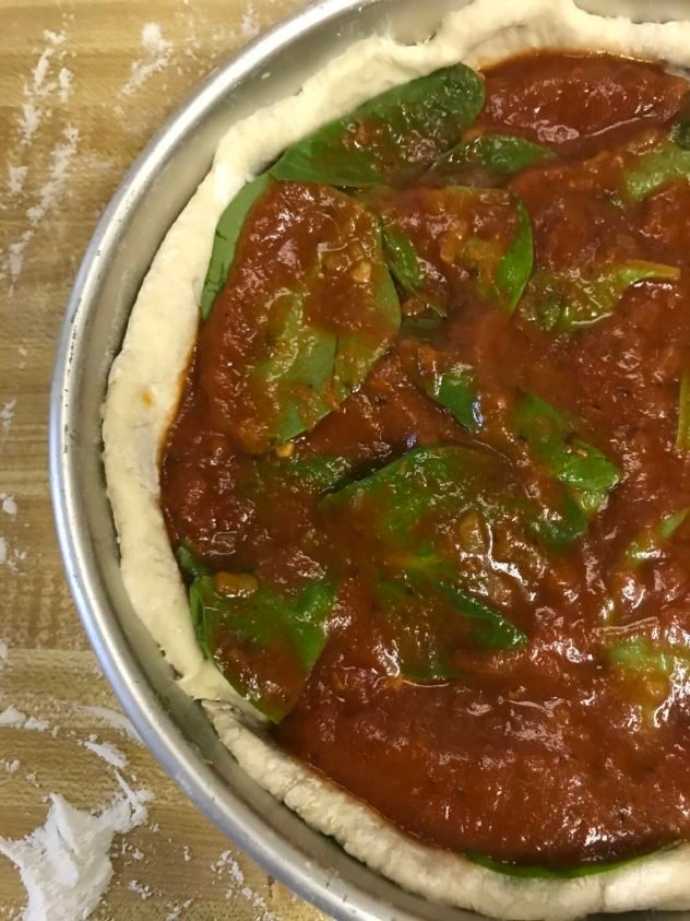 Did you guys know that my skinny pizza dough makes great Chicago style deep dish pizza? I could have sworn I had leftover pizza dough in my fridge, but for the life of me couldn’t find it. When I asked Hannah if she had seen it, she said “look in the leftover bin!” Yes, there is a rectangle tray in our fridge dedicated to leftovers. When it wasn’t there, I just made a quick batch on the fly. Wouldn’t you know that I found it this morning. . .in the meat drawer. Which is why Hannah can’t stand the way I organize my fridge.