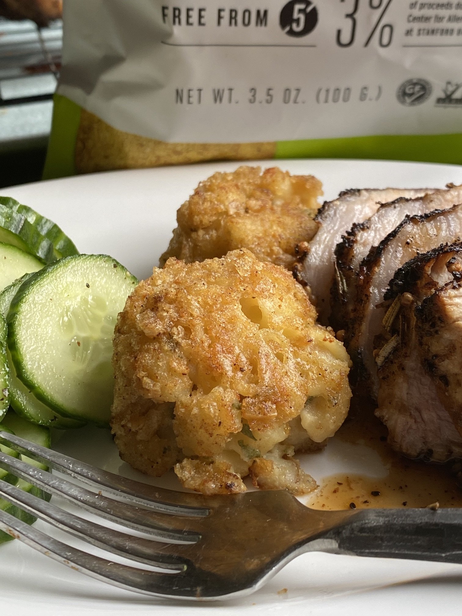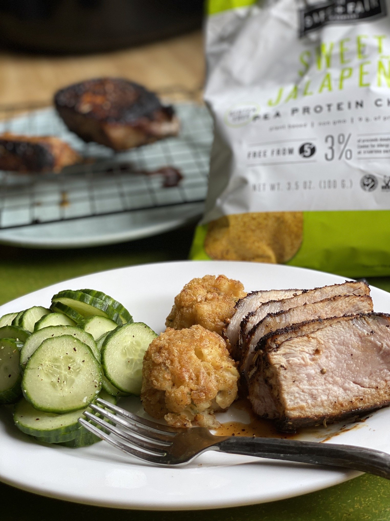 The first night I had sliced pork and I made macaroni and cheese balls. Um, best decision ever! The macaroni and cheese recipe I just posted last week? I took a melon ball and crushed up some Safe + Fair Jalapeno pea chips and used that as a coating, sprayed it with avocado oil and air fried for 7 minutes at 360. They were delicate once I took them out of the air fryer, but after a couple minutes firmed up. So good. Don’t forget you can use my discount Biz20 to save 20% off your order. If you spend over $20 after my discount, you get free shipping too!