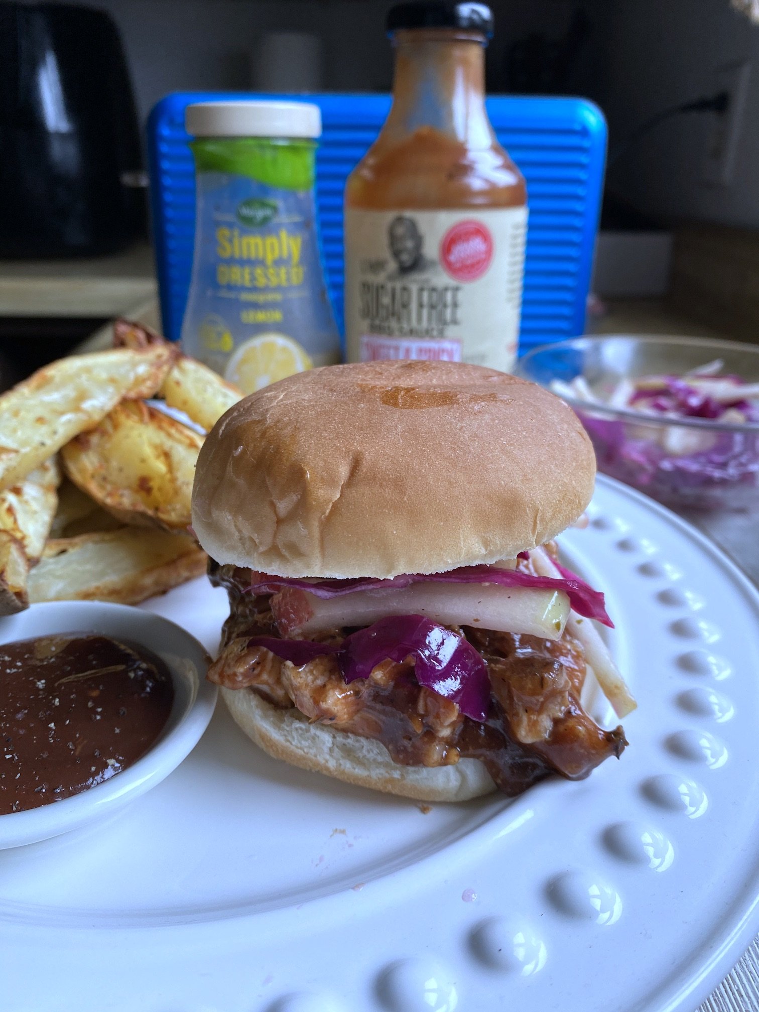 This is so good. I made three pork bbq sandwiches last week. Just chopped up 3 ounces of leftover pork and heated it up in the BBQ sauce, then made a quick cabbage and apple slaw (1/3 cup sliced apple, 1/3 cup sliced red cabbage, 1 tablespoon Marzetti’s lemon vinaigrette and a splash of red wine vinegar) and made leftover baked potato fries. The pork is 3 points and the bun is 3 points – so that’s a generous sandwich for 6 points!
