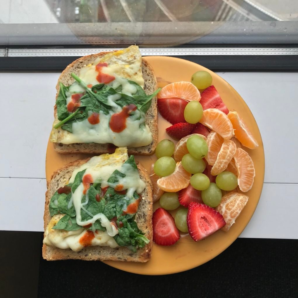 When I was making my breakfast yesterday I made a 1 point omelette and thought I needed to add some bread to that meal. Luckily my train station has a huge market and I bought a loaf of whole wheat sourdough bread – and decided to make open faced egg Sammie’s. Each slice of bread is 2 points – I’ll spend all my points on good bread- Breakfast is 5 points.