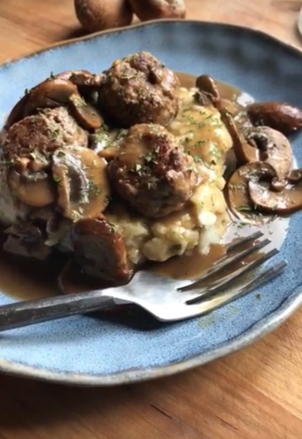This is veal meatballs over parsley garlic mashed potatoes and a mushroom pan sauce – literally a 10 minute meal with the prepped meatballs.