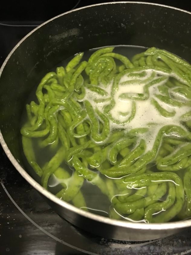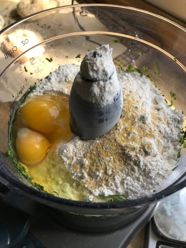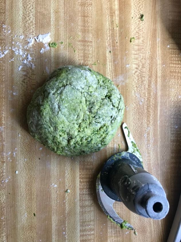 Place six ounces of spinach in a food process and process until its pretty minced. Add 2 cups flour, two large eggs, 1 teaspoon of salt. I used seasoned salt because can you believe I am out of regular salt?!