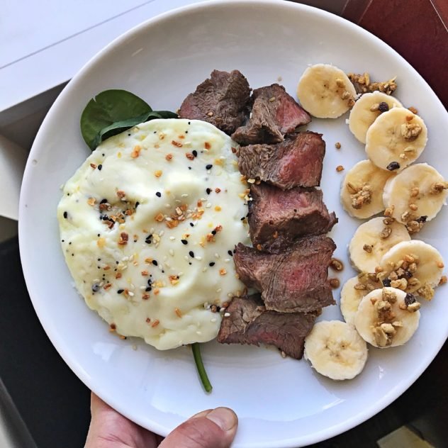 Why do I always forget how long beef keeps me full when I eat it for breakfast? Three ounces of beef (3) with an egg white with spinach topped with Trader Joe’s lite mozzarella (1) and bananas and granola on the side for dessert (2). This was so tasty!