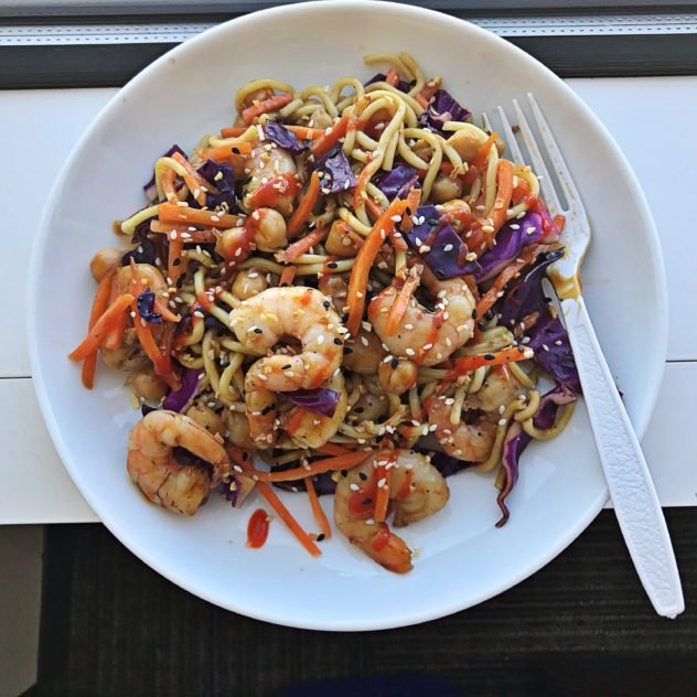 If you follow my Instastories on Instagram, than you would have seen that I cooked up shrimp and noodles before work, and just put them in a container and threw it in my backpack. I knew I could accessorize my lunch with either the hot bar or salad bar at Mariano’s, and I needed to get a couple condiments for work.