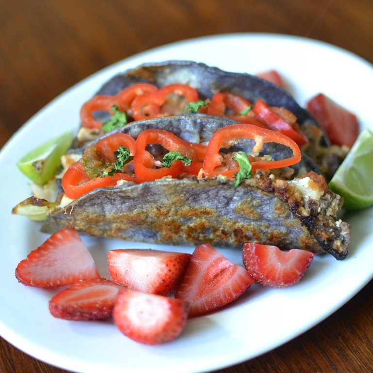 Next to pizza, I think breakfast tacos may be another favorite meal of mine. I like how you can throw anything into it, with some egg whites, and call it breakfast. I remember telling my farmers market Alberto that my local grocery store sold blue corn tortillas and he adamantly told me that I was not buying blue corn tortillas. I argued “but they are blue!” He told me “check the label.” Sure enough, what I thought were actually blue corn maze tortillas were actually regular corn tortillas with . . . blue dye #1. Damn!
