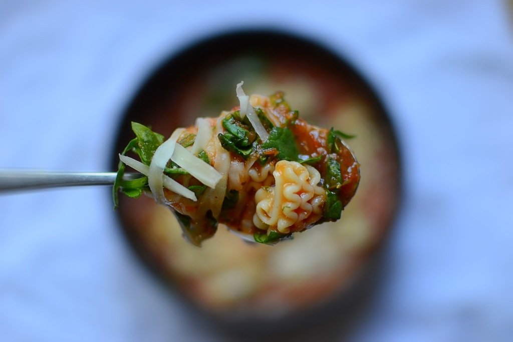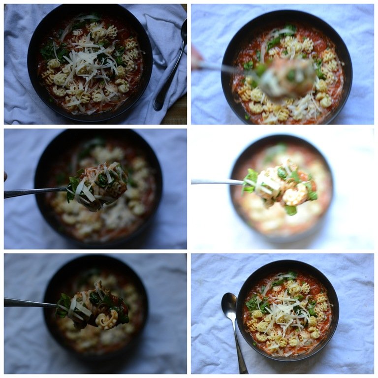 As it’s getting towards the end of the week, some stuff gets pushed into the back of the fridge and gets forgotten. I had some cooked pasta, and in the back a jar of lasagna soup that either needed to be used up or frozen. You all know how much I love this lasagna soup, and I was trying to figure out how to take a different photograph for Instagram. Well, just because you have a DSLR doesn’t automatically mean that your pictures are going to turn out stunning. Seriously, I’ve had my camera for nearly five years and it’s still a learning process. What worked one time, doesn’t work the next because the lighting is different, etc. Case in point: