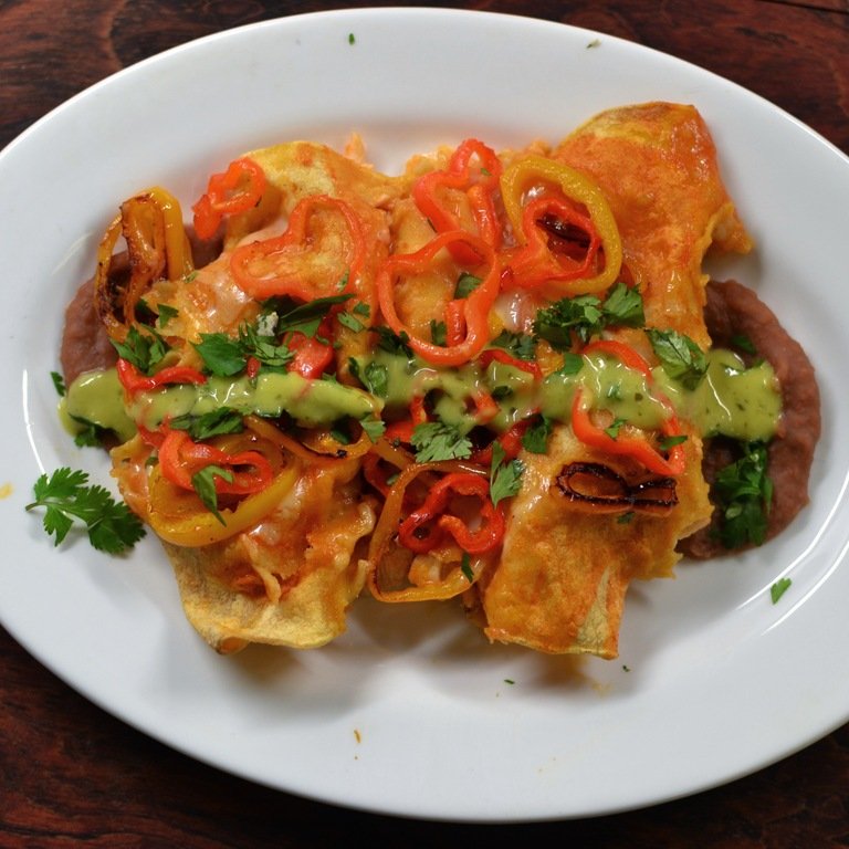 It was 1/4 cup refried beans on the bottom (1) three tortillas (4) three ounces chicken (2) an ounce of 50% reduced fat Cabot cheese (2) 1/4 cup enchilada sauce (1) and a tablespoon of Herdez brand avocado salsa that tastes amazing for 1 point. Not pictured is half an ounce of chips for dipping. I also sauteed some baby peppers to put on top, so it was kind of like an enchilada chicken fajita.