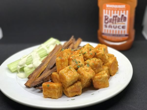 - Spray a skillet with avocado oil spray. Cook the tofu on all sides until crispy, about 5 minutes. Toss in buffalo sauce. Serve with fries and celery sticks.